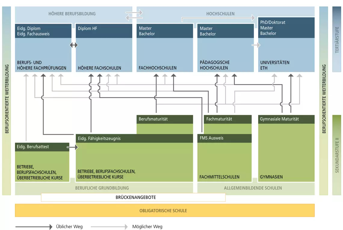 Kein Abschluss ohne Anschluss: Diesem Grundsatz folgt das schweizerische Bildungssystem. Es bietet auf jeder Stufe qualitativ hochwertige Anschlüsse, die jeweils Zugang zu einer Vielfalt weiterer Ausbildungswege öffnen.